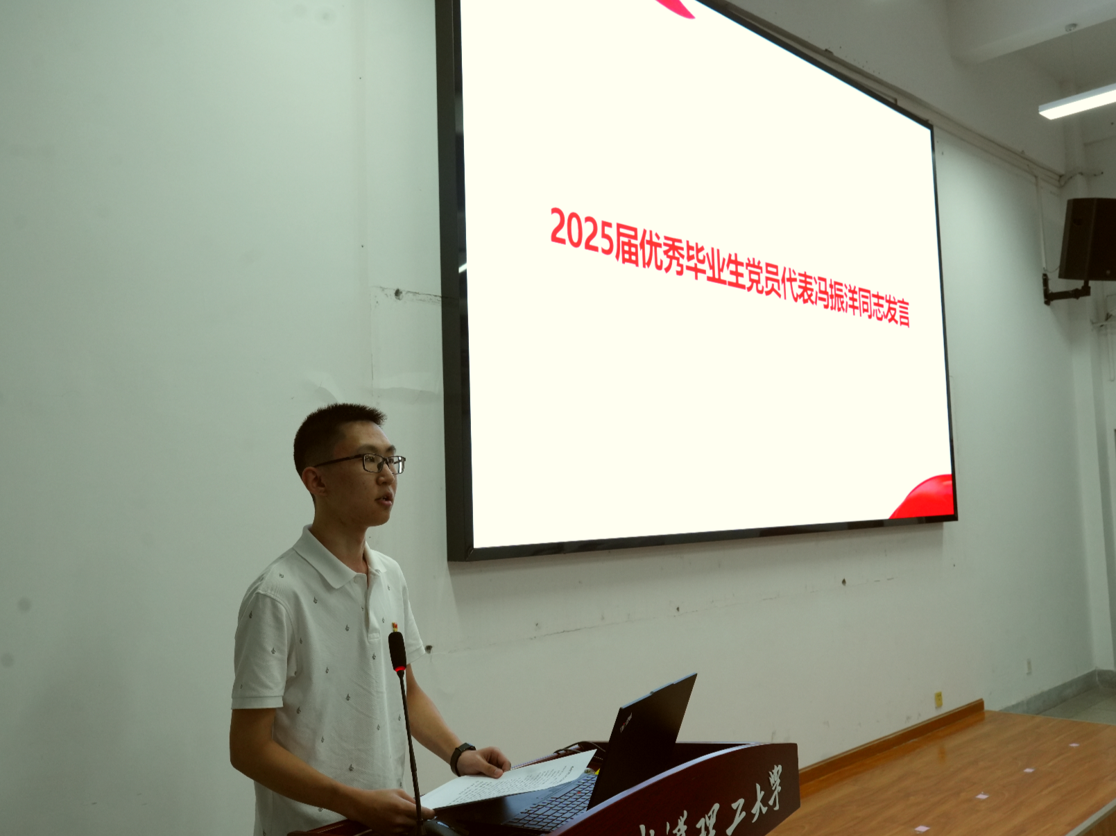 2025届优秀毕业生党员代表冯振洋同志上台发言,他表达了对党组织培养的感恩之情,并号召全体毕业生党员在未来的工作和生活中,继续发挥党员先锋模范作用,以实际行动践行初心使命。